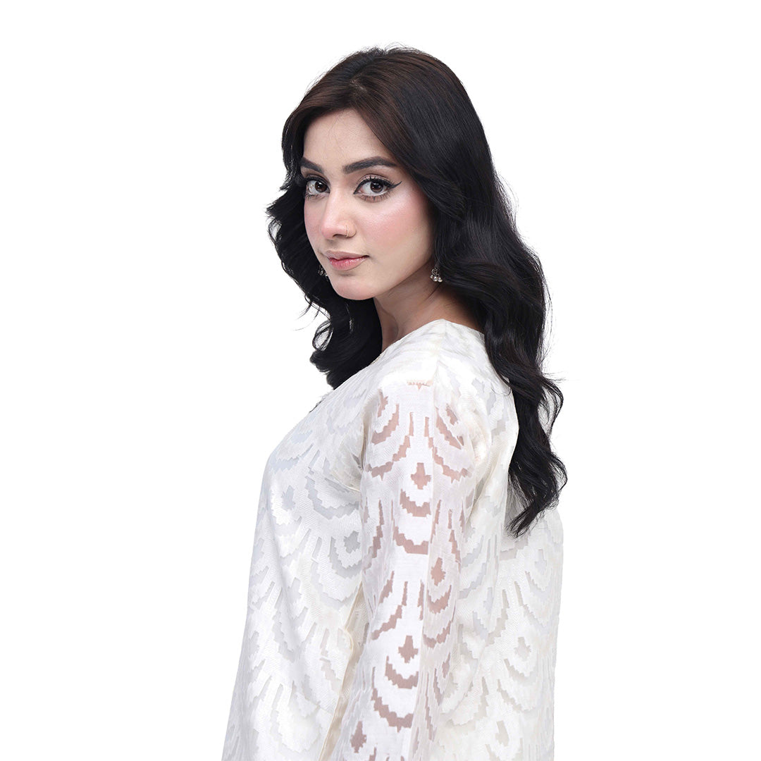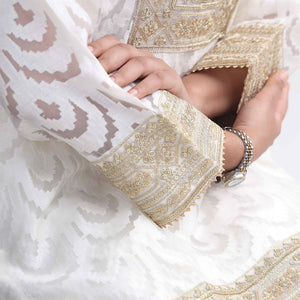 A beautifully crafted two-piece ensemble that blends tradition with sophistication. The jacquard shirt features delicate gold embroidery, complementing the rich texture of the raw silk trousers. The pristine white and gold contrast makes it a perfect choice for festive occasions and celebrations.