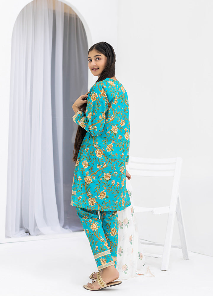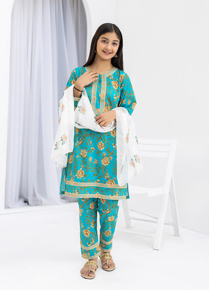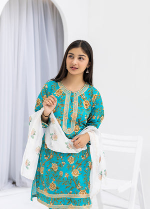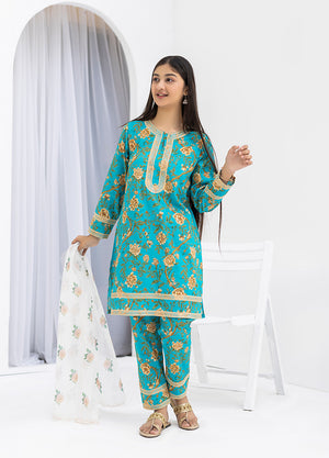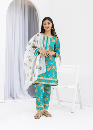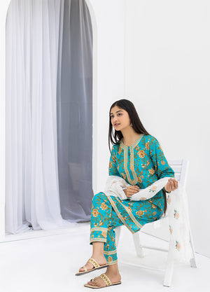 This sophisticated 3-piece collection presents a harmonious blend of traditional craftsmanship and contemporary design in an elegant ferozi shade. Engineered from pure 100% cotton, the digitally printed kurti incorporates refined embroidery accents that enhance its visual depth. The matching trousers feature coordinated digital printing with decorative embroidery at the hem, ensuring visual continuity throughout the ensemble.