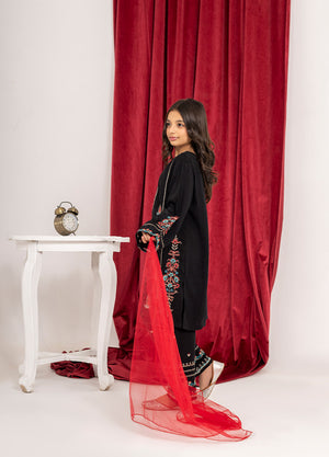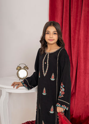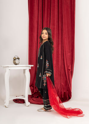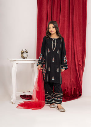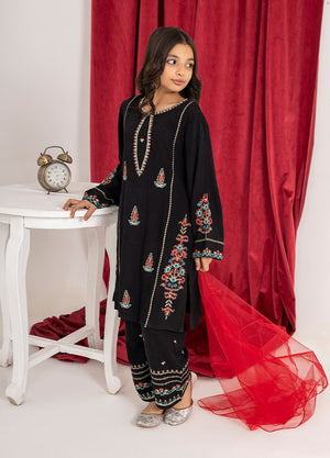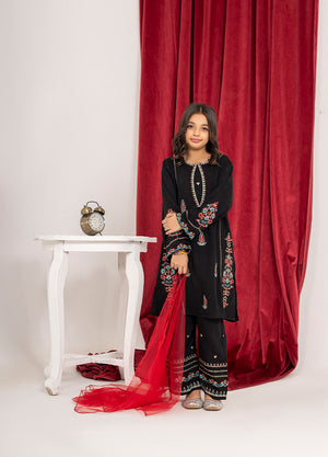 Step out in timeless sophistication with this striking three-piece collection! Made from 100% pure cotton, this ensemble showcases a gorgeously dyed and embroidered kurti paired with coordinating embroidered trousers that complete the look flawlessly. The classic black hue exudes elegance while the intricate embroidery details add personality and charm.