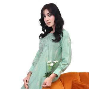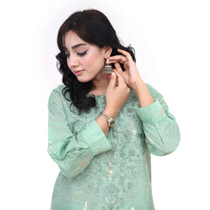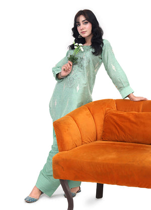 A graceful 2-piece set featuring a yarn-dyed jacquard shirt paired with a traditional farshi shalwar in raw silk. The intricate embroidery on the neckline adds a refined touch, while the woven zari patterns within the fabric create a subtle shimmer. Designed for a timeless look with effortless comfort.